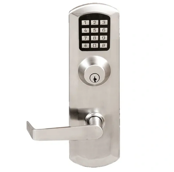 The TS2000 Series is available with select Detex Advantex and Value Series Rim and SVR exit devices. It uses a patented motorized exit device trim with lever and keyed cylinder. 10 different keys are available to match. Programmed at the keypad using numerical commands to enable/disable codes, pass time, sounds, status indicator and lever functions. The TS2000 exit trim mounts directly to surface of door with through door wiring into a battery pack that is secured onto the secure side of the door. The electronics in the keypad are coated to provide dust/water resistance and meets IP65 rating. May be used in weatherized and non-weatherized environments.