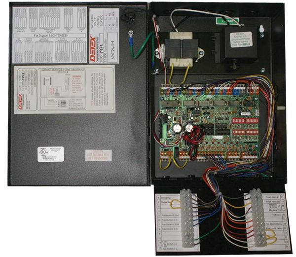 The Detex 12-800 is a universal logic and power supply controllers that allow for total control over all electrified hardware. The controller receives input from a switch, access control or any dry contact device and processes it into the desired output. One controller can manage applications for up to two doors, such as standard egress, delayed egress and interlocks. All connections for local or remote signaling are contained in one box. The 12-800 logic controllers provide at least 2A of DC power at the door.