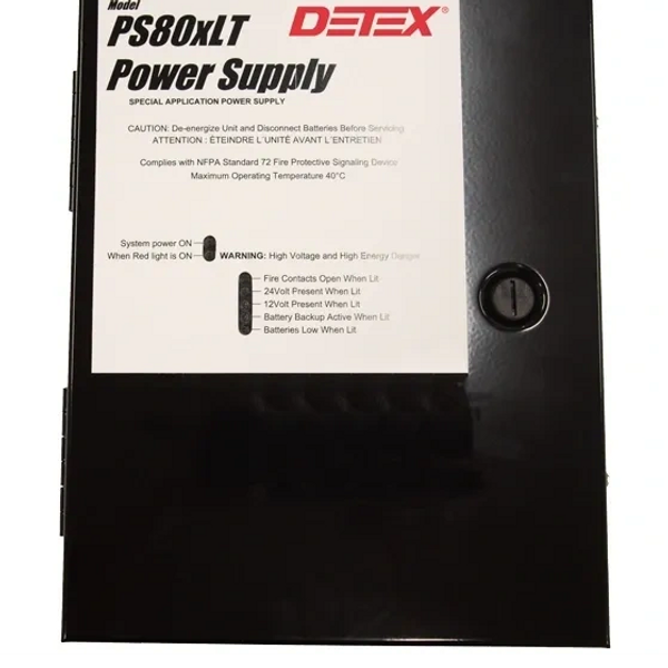 The Detex PS80 Power Supply is designed for applications requiring a continuous supply of a regulated, filtered output voltage. The Detex PS80 Power Supply includes a battery charging circuit. Batteries provide backup for uninterrupted service.